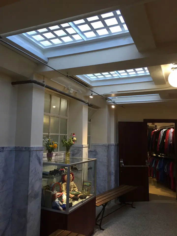 Then I ran across this little jewel. They imbedded glass blocks into the sidewalk surrounding the middle level, which became skylights for the basement level.