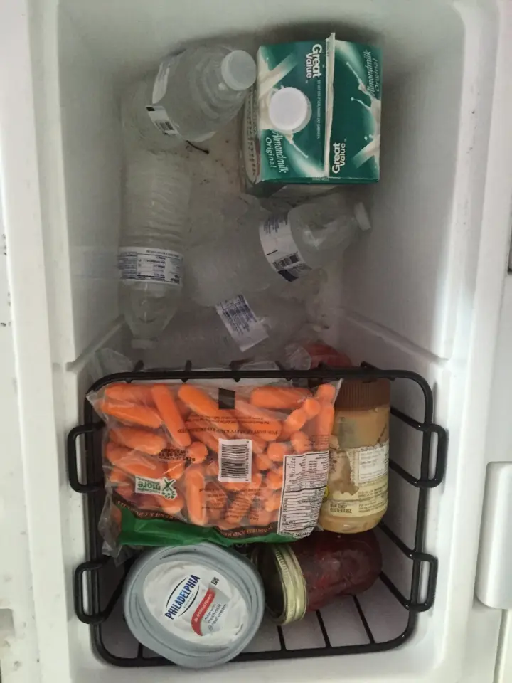 Saturday morning, when it was time to leave, I went down to check on the ice level, and the condition of my provisions. This is what I found.