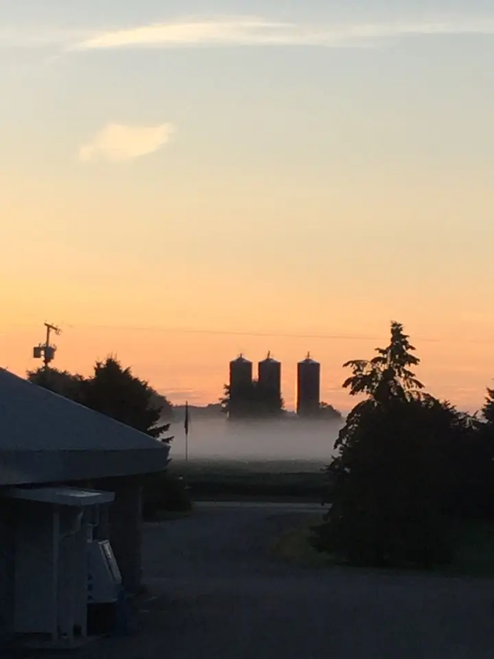 The sky backlit the silos of the Amish farm across the highway from the campground, and the band of mist just above ground level made for a view that screams we have a creator.